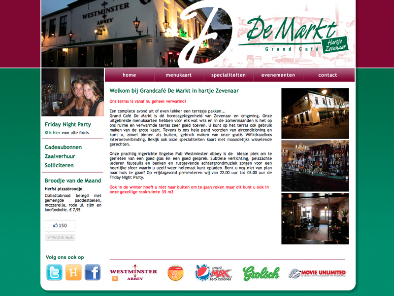 Grandcafé De Markt is al enkele jaren vaste klant bij Sprong reclamestudio. Naast allerlei print uitingen verzorgde Sprong reclamestudio ook de vormgeving van de website. De technische realisatie was in handen van Gepkens Internetdiensten.